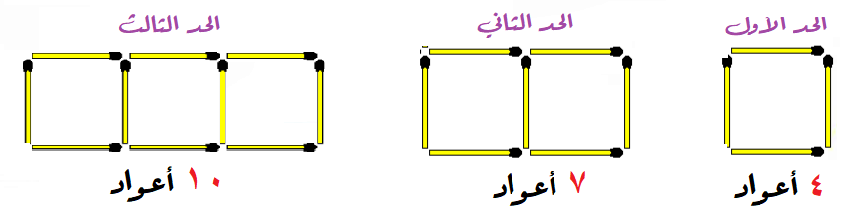 نمط المربعات وأعواد الكبريت [عدد الأعواد = (عدد أضلاع الشكل -١) × عدد الأشكال المطلوبة + ١]