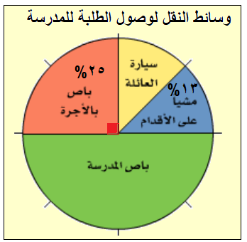 يبين التمثيل بالقطاعات الدائرية أربعة وسائل يصل بها الطلاب إلى مدرستهم (مشيا على الأقدام ١٣%من الطلاب / باص المدرسة ٥٠%من الطلاب/ باص بالأجرة ٢٥%من الطلاب/ وتصل نسبة منهم للمدرسة بسيارة العائلة).بحسب البيانات في التمثيل التالي، ما زاوية القطاع (الأصفر) الذي يمثل وصول الطلاب بسيارة العائلة؟